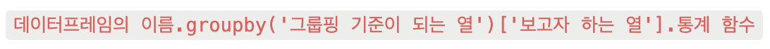 # - pivot_table(index = ['그룹핑하고 싶은 열의 이름'], aggfunc = '그룹핑 후에 수행할 연산')