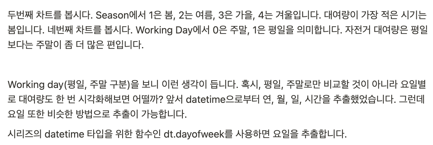 * workingday - 1 = 토, 일요일의 주말 및 휴일이 아닌 주중, 0 = 주말 및 휴일