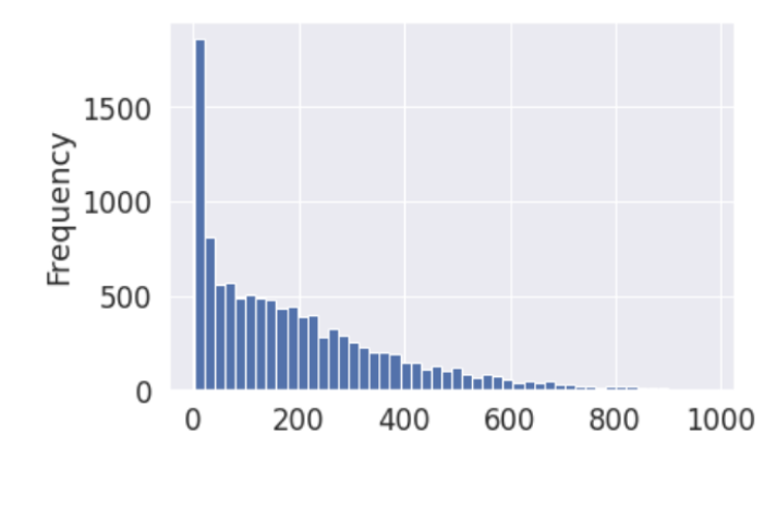 다음과 같이 분포가 0~200 사이의으로 몰려있는 것을 확인할 수 있습니다. 이렇게 데이터가 한 쪽으로 몰려있는 경우를 우리는 '데이터의 분포가 정규 분포가 아니다' 라고 말합니다.