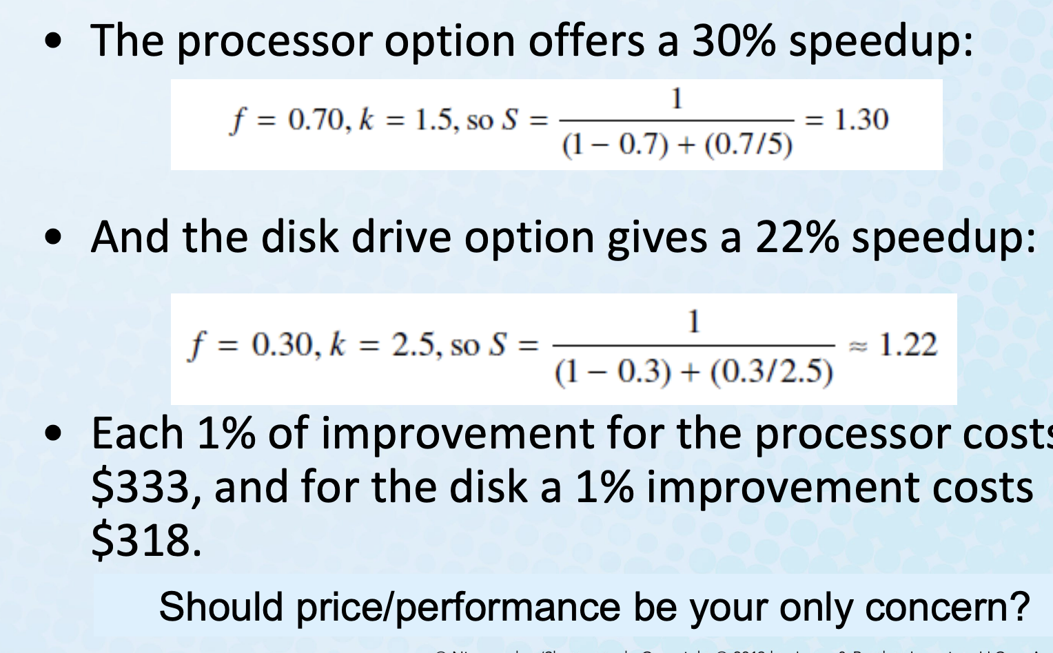 On a large system, suppose we can upgrade a CPU to make it 50% faster for $10,000 or upgrade its disk drives for $7,000 to make them 150% faster. • Processes spend 70% of their time running in the CPU and 30% of their time waiting for disk service. • An upgrade of which component would offer the greater benefit for the lesser cost?