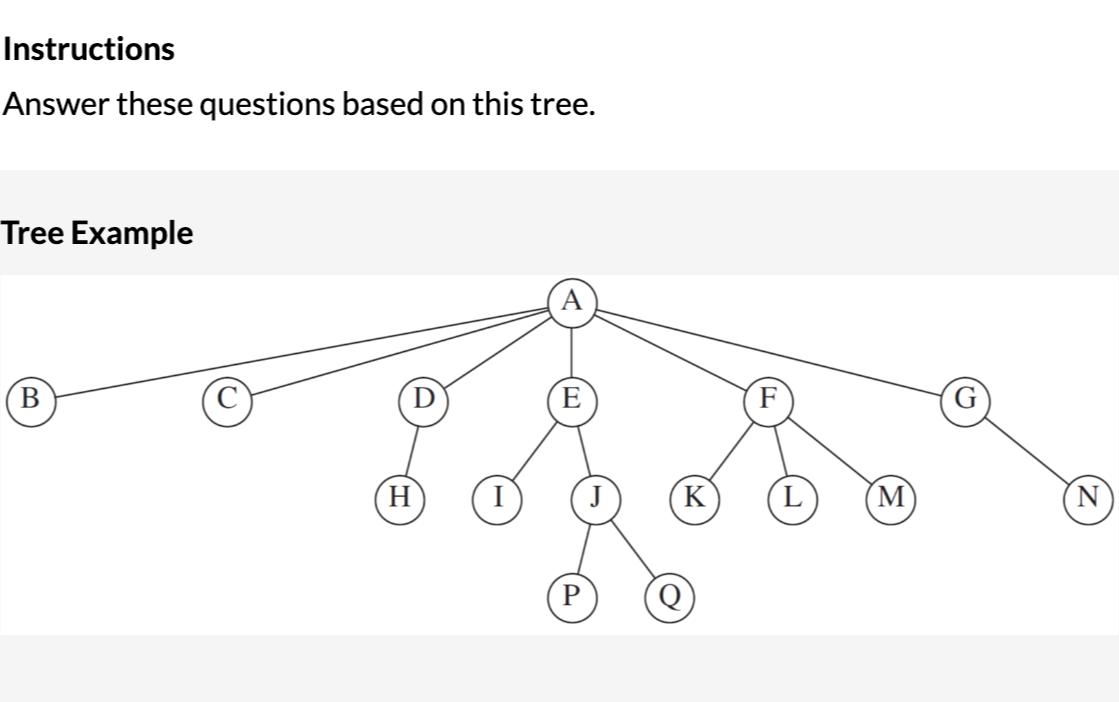 1. What are the height and depth of the J node in the tree above?