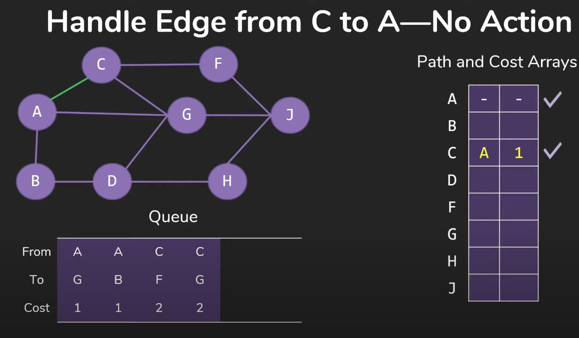 Implementation: priority queue(min-heap), (Vertex, Prev, cost, found(to use count))