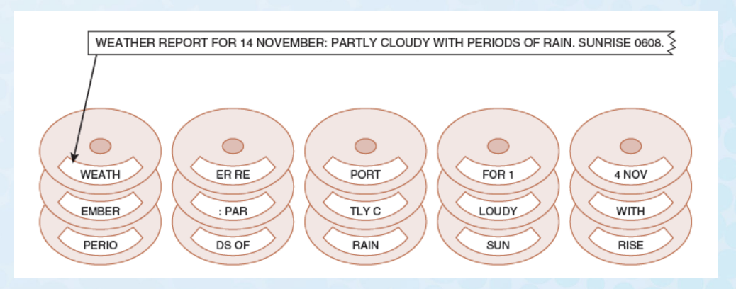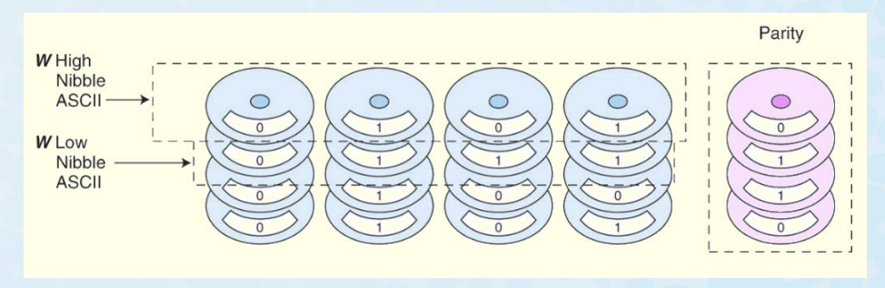 – Data is written in blocks across the data disks, and a parity block is written to the redundant drive.