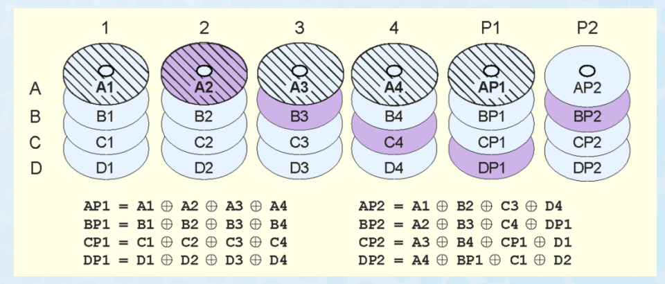 • Of course, because two parity functions are involved, RAID DP’s performance is somewhat degraded from that of RAID 5.