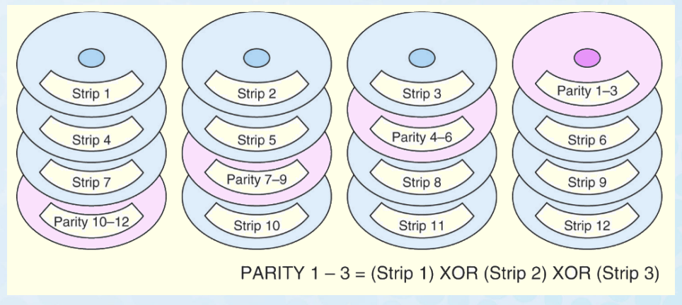 – With distributed parity, some accesses can be serviced concurrently, giving good performance and high reliability.