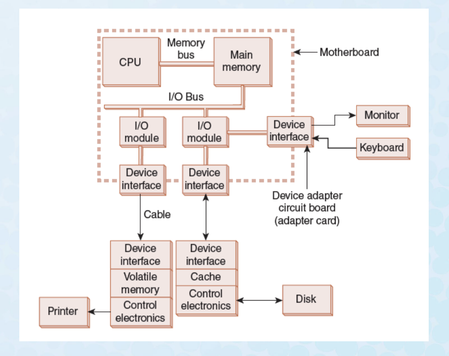 • I/O systems consist of memory blocks, cabling, control circuitry, interfaces, and media.