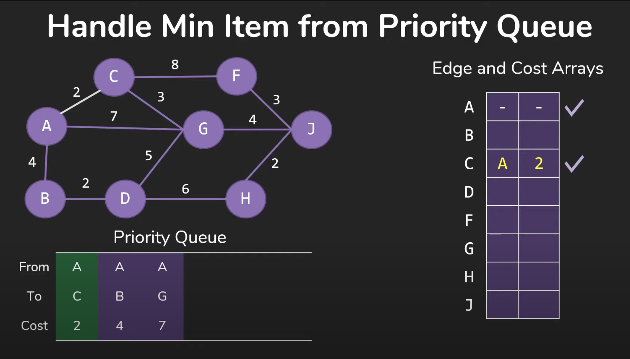 Implementation: priority queue(min-heap), (Vertex, Prev, cost, found(to use count))